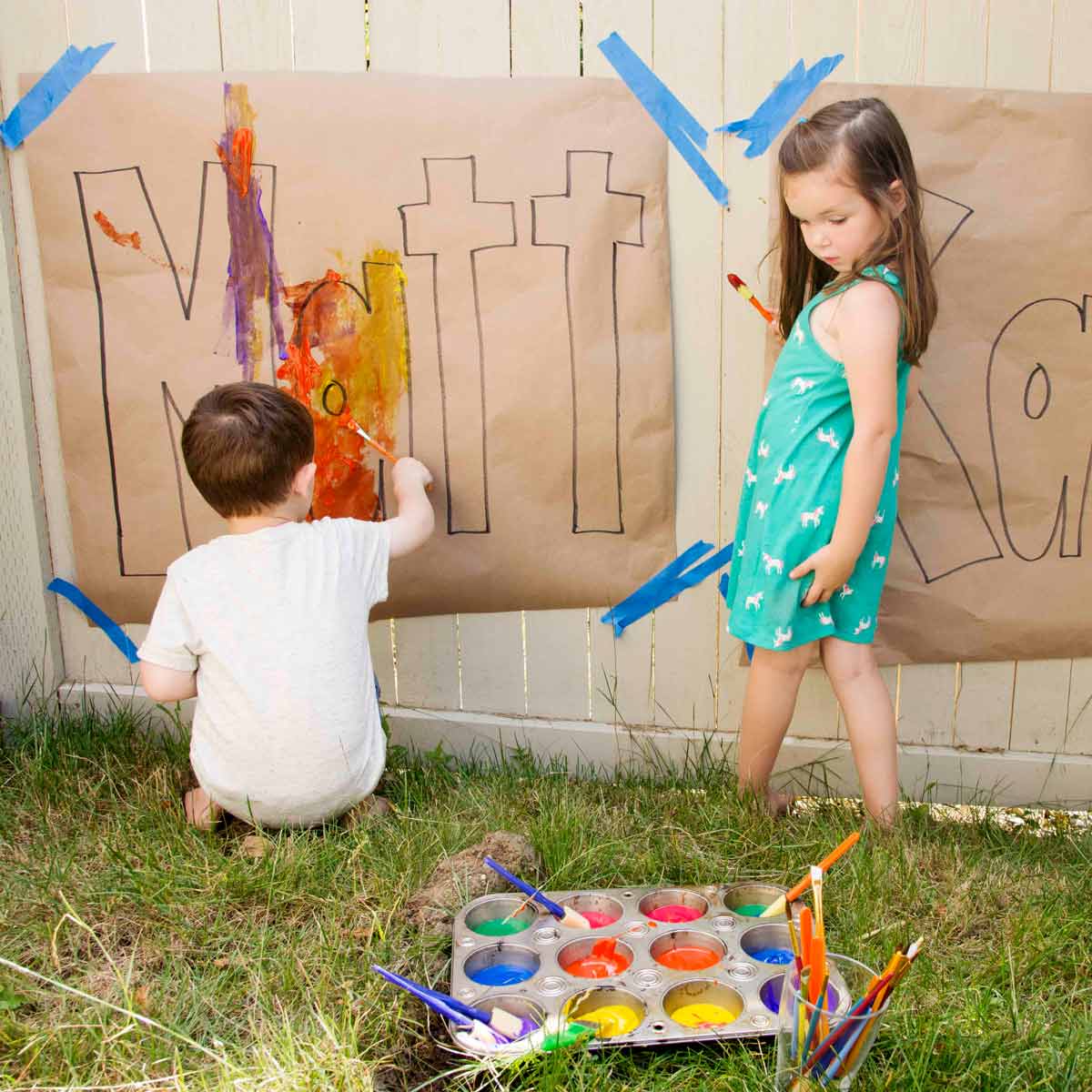 - Set up an easel or tape large sheets of paper to a fence or outdoor surface.