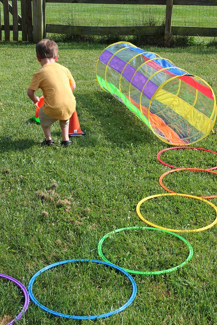 - Guide your toddler to hop through the hoops, run around the cones, and jump over the rope.